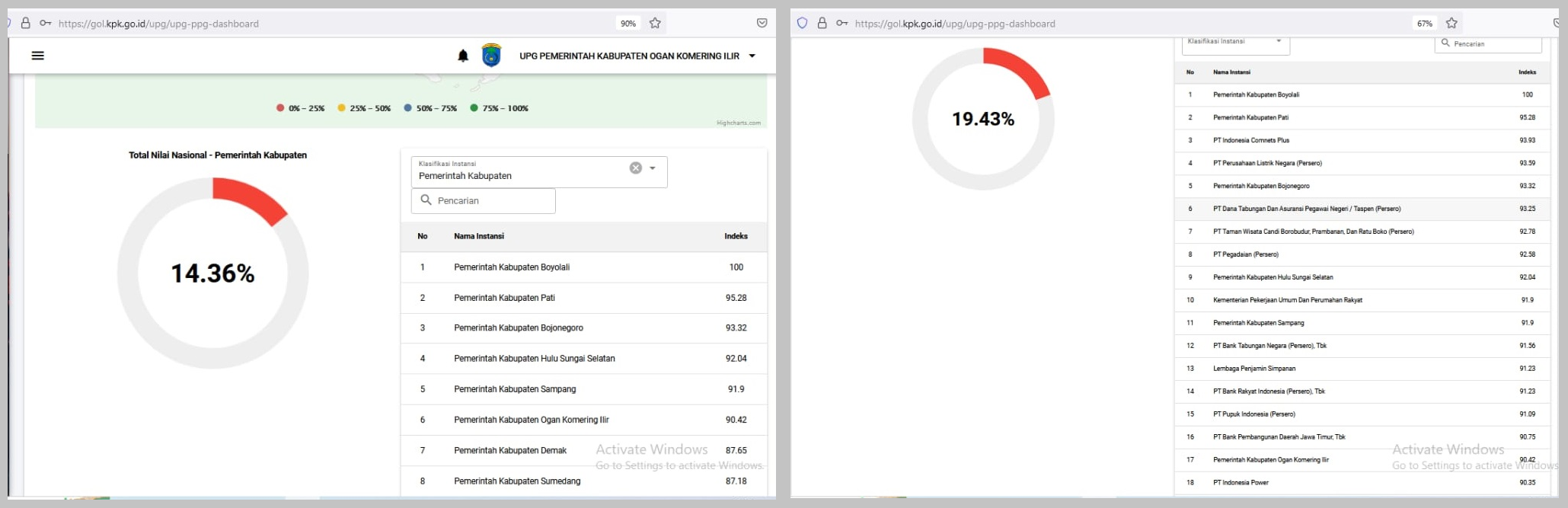 Administrator | Daerah | 19 August 2022 | 0Berdasarkan hasil monitoring dan evaluasi dari Komisi Pemberantasan Korupsi (KPK) pada tanggal 18 Agustus 2022, Alhamdullilah Unit Pengendalian Gratifikasi Kabupaten Ogan Komering Ilir (OKI) untuk semester 1 Tahun 2022 berhasil menembus ranking 17 dari 611 instansi, baik daerah maupun swasta yang telah mengisi rencana kerja dan realisasi semester 1 tahun 2022 secara nasional dengan indeks nilai 90,42%. Jika diurutkan perkategori level pemerintah kabupaten se Indonesia, Pemerintah Kabupaten OKI telah berhasil memperoleh peringkat 6 nasional. Keberhasilan ini juga menunjukan capaian terbaik Unit Pengendalian Gratifikasi Kabupaten OKI se Sumatera Selatan berhasil meraih peringkat 1.